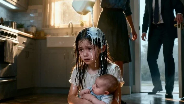 Emily était accroupie sur le carrelage, du lait coulant dans ses cheveux, sa robe trempée, des flaques s’étendant autour de ses genoux. Elle serrait Alex contre sa poitrine, le petit visage enfoui dans son épaule. Debout au-dessus d’eux, le visage tordu par la colère, se tenait Vanessa — tenant le bidon de lait vide comme une arme.